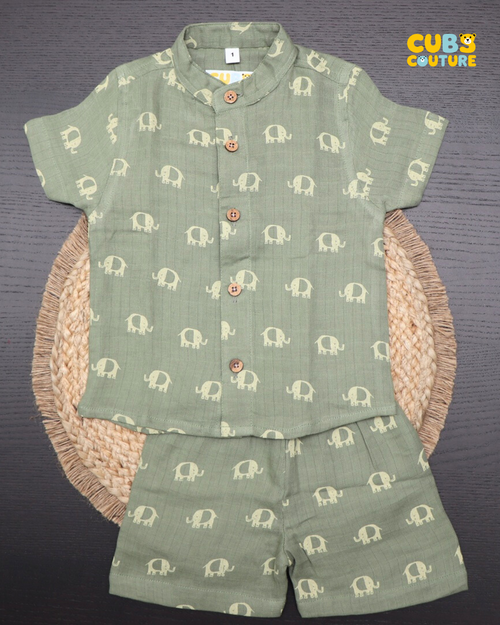 Coloured Muslin Co-ords Shorts - Olive Green Elephants